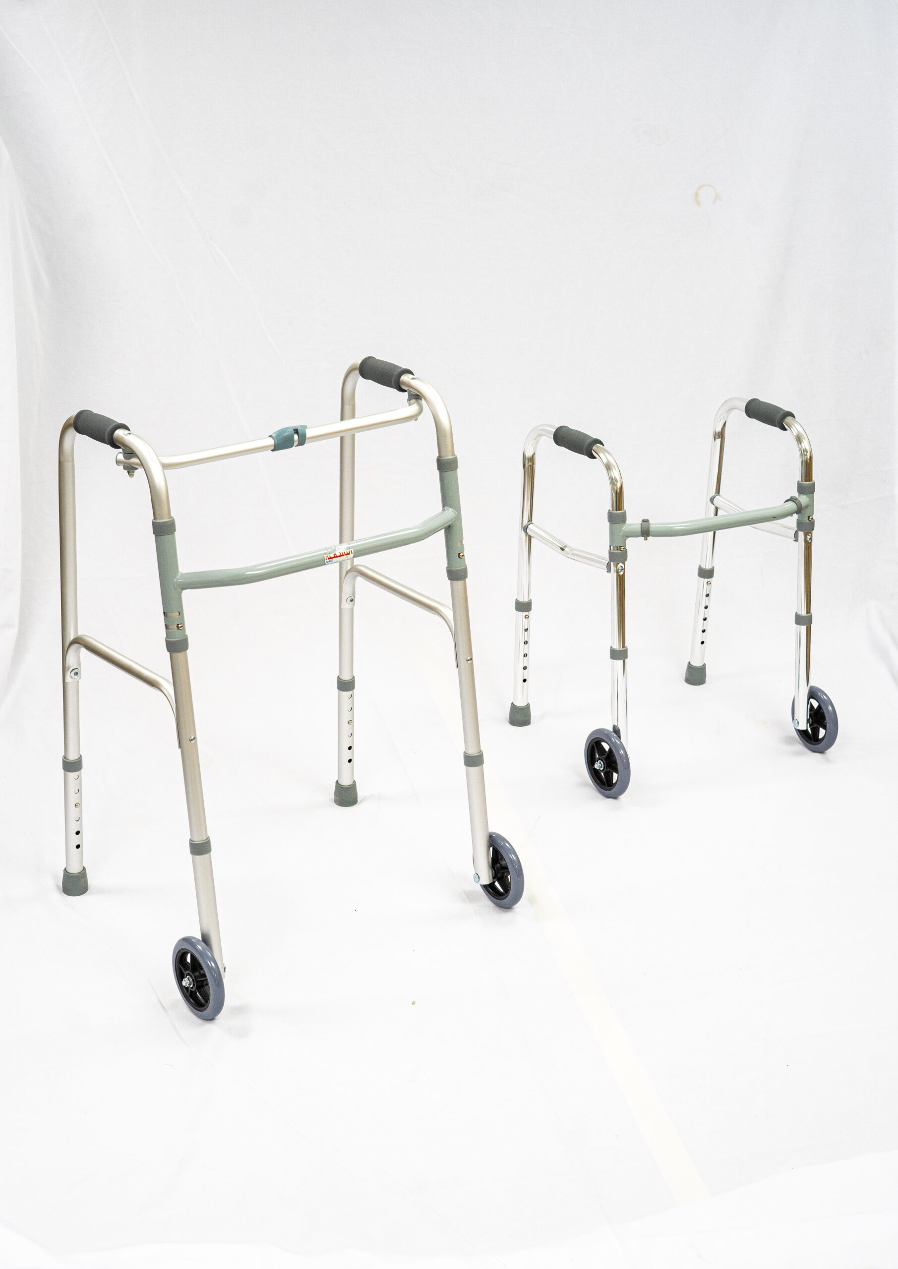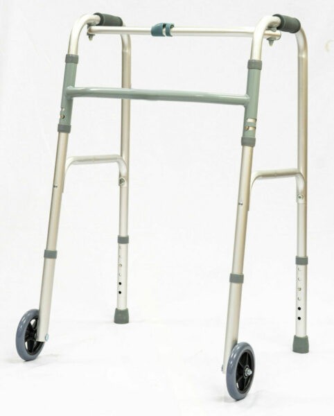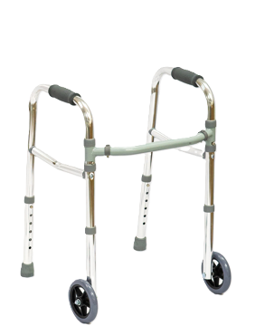 Caminador con funciones: 2 ruedas delanteras y 2 puntos apoyo anti resbalante, Cada lado funciona de manera independiente para permitir el movimiento fácil a través de espacios estrechos y una mayor estabilidad mientras está de pie. Los mecanismos de botón fácil pueden ser operados por los dedos, las palmas de las manos o lateral de la mano.
